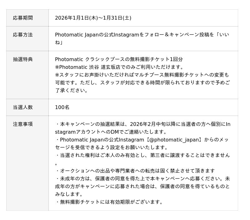 キタムラ・ホールディングス グループのピックハイブ株式会社(本社:東京都新宿区、代表取締役社長 兼 COO:大迫 由典)が運営するセルフフォトブランド「Photomatic(読み:フォトマティック)」は、2026年1月1日(木)から1月31日(土)の期間中、フラッグシップショップであるPhotomatic 渋谷 道玄坂店とPhotomatic Japanの公式Instagramにて、新しい1年の幕開けを記念したNew Year Campaignを開催いたします。
