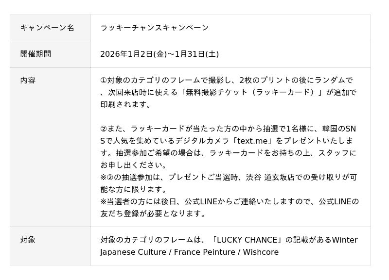 渋谷 道玄坂店のクラシックブースで、対象のカテゴリのフレームで撮影していただいたお客様の中からランダムで次回来店時に使える「無料撮影チケット(ラッキーカード)」が当たります。