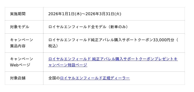 この度、ロイヤルエンフィールド全モデルと純正アパレルの販売拡大を目的に、2026年1月1日(木)から2026年3月31日(火)までの間、「ロイヤルエンフィールド純正アパレル購入サポートクーポンプレゼントキャンペーン」を実施いたします。