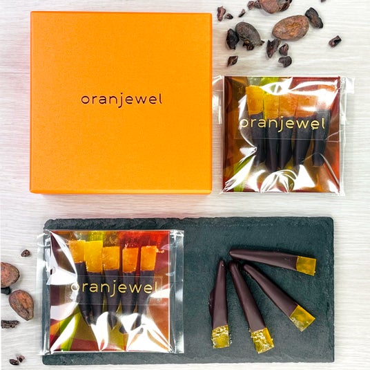 “和製グレープフルーツ”とも呼ばれる河内晩柑の爽やかなほろ苦さを、ビターチョコレート「アルアコ72%」と合わせた、清々しい余韻のオランジェット。