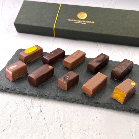 一粒ごとに香りがふわりと抜け、食べ終わった後に心地よい余韻が残る──。アッサンブラージュカキモトが大切にしている「素材の香りの変化」と「口どけのなめらかさ」を堪能できる、10種のボンボンショコラの詰め合わせです。バニラやフィナンシェといった王道はもちろん、セロリやみょうがなど“本来ショコラにならない”はずの素材まで、料理人ならではの発想で見事なひと粒に昇華。素材の組み合わせによる驚きと美味しさを楽しめる、まさに“食べる芸術”。