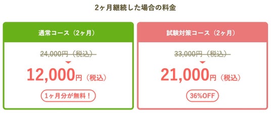 2ヶ月継続した場合、通常コースは実質1ヶ月分が無料!試験対策コースも36%OFF
