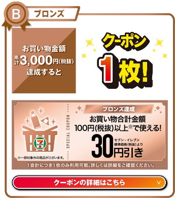 公共料金、インターネットショッピングのお支払い、ハガキ、切手、印紙、クオ・カード、金券、プリペイドカード、地域指定ゴミ袋・ゴミ処理券、前売券、マルチコピー機によるチケットサービス、一部新聞、お土産(※一部エリア)、自賠責保険、nanaco発行手数料、nanaco・楽天Edy・交通系IC・コード決済現金チャージ代、7NOW配送手数料等は対象外になります。(セブン‐イレブン ネットギフトサイトのギフトは、店頭でお支払いされた場合のみ対象です。インターネットで精算まで完了した場合は対象外です。)