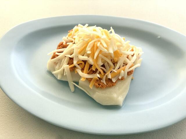 さらにおススメなのが、シュレッドチーズを乗せてチーズが溶けるまでレンチンしたピザ餅風。