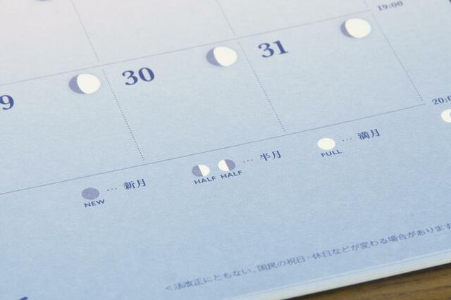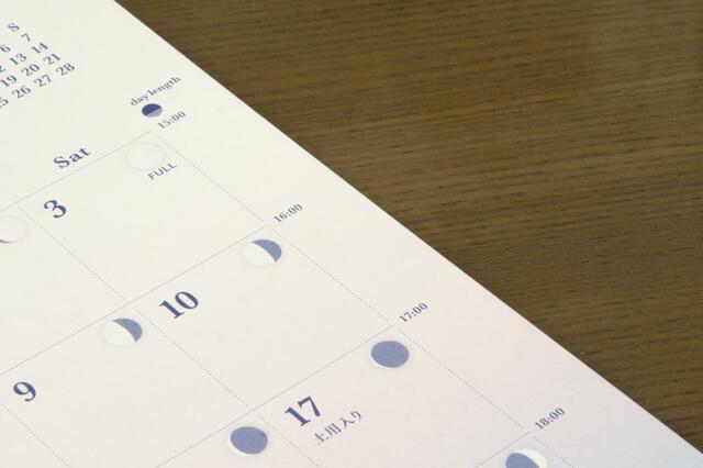 グラデーションでの日の入り時間だけではなく、「月の満ち欠け」に「二十四節気」「雑節」といった季節を示す目印も記載されています。