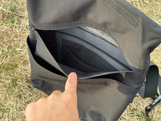 マジックテープ開閉式の蓋を開くと第一ポケットがあります。