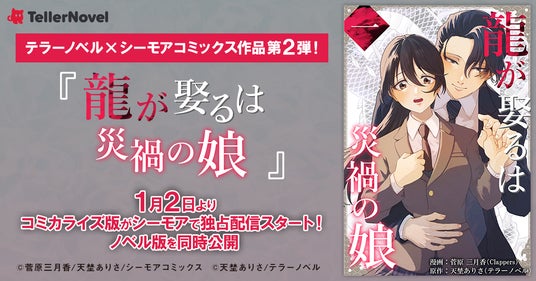 株式会社テラーノベル(本社:東京都港区、代表取締役社長:蜂谷宣人)は、テラーノベル原作『龍が娶るは災禍の娘』がコミカライズされ、コミックシーモアでの独占配信を2026年1月2日(金)より開始することをお知らせします。また同作品のノベル版をテラーノベル( https://teller.jp/ )にて同時公開します。本作品はテラーノベルとシーモアコミックスの共同制作の第2弾となり、今後も新作のリリースを予定しています。