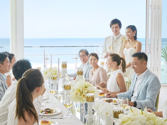 セレモニー後には、海が目の前に広がるラウンジでゲストと語らう「Celebration Time」をご用意。ウェルカムシャンパンやフィンガーフードを片手に、ゲストとかけがえのない時をお楽しみいただけます。また、目の前に海が広がる絶景のオープンエア・バンケットでのパーティでプライベートな時間をお過ごしいただけます。