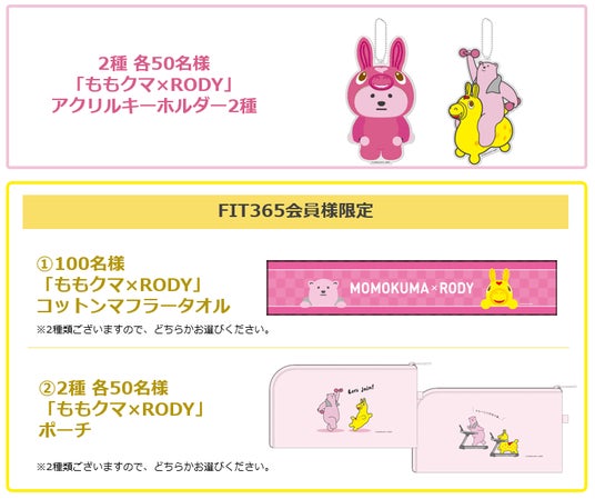午年である今年10周年を迎えるFIT365の公式キャラクター「ももクマ」と「RODY」がコラボレーション!期間中オリジナルノベルティがもらえる様々なプレゼントキャンペーンを開催!
