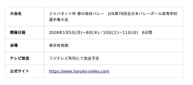株式会社ジャパネットホールディングス(本社:長崎県佐世保市/代表取締役社長 兼 CEO:高田旭人)は、2026年1月5日(月)~8日(木)/10日(土)~11日(日)の6日間、「ジャパネット杯 春の高校バレー JVA第78回全日本バレーボール高等学校選手権大会」に特別協賛いたします。