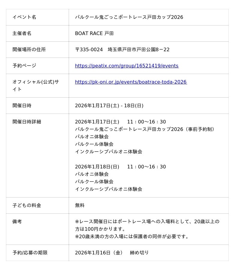 BOAT RACE 戸田で開催される「パルクール鬼ごっこボートレース戸田カップ2026 」では、「あそびがカラダを作る!」をテーマに、パルクール鬼ごっこで楽しさとともに能力を向上させる、小学生以下及びその保護者を対象とした限定のイベントを1月17日(土)・18日(日)で2日間に渡り開催!