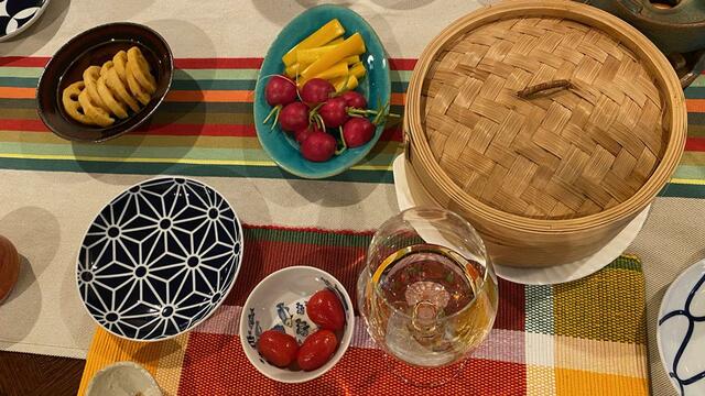アペタイザー:クリームチーズ、ミニトマト、燻製カシューナッツ、蒸し野菜のバーニャ・カウダ(カリフラワー、カボチャ、蕪)。