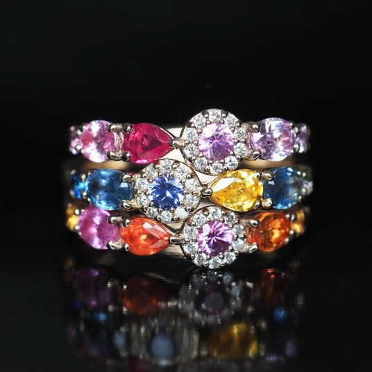 一方で、桜を思わせる淡いピンクや、ホワイト、パープル、グリーンなど、やさしい色合いの組み合わせも展開。コランダムならではの発色の良さが際立ち、穏やかな色調の中にも確かな存在感を感じさせます。