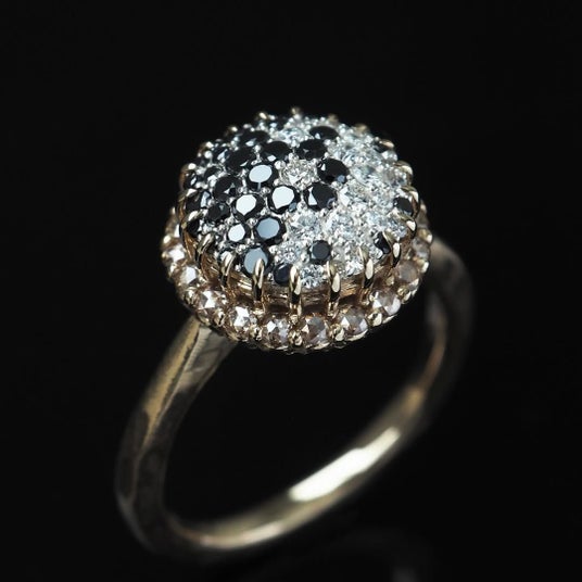 宝石を隙間なく配した本物のパヴェが放つ眩い煌めきと、ローズカットダイヤモンドならではの上品で柔らかな輝き。その二つが重なり合うことで、奥行きのある表情が生まれます。淡く溶け合うグラデーションや、透明感を引き立てるトーンミックスによって構成された色彩は、見る角度によって異なる印象を描き出します。