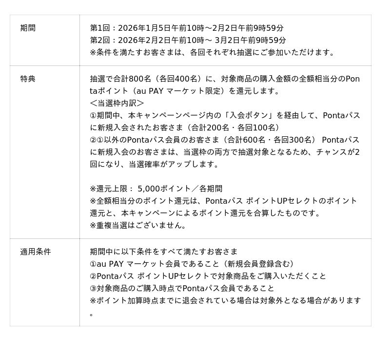 KDDIは、2026年1月5日から3月2日まで、au PAY マーケットにおいてPontaパス会員を対象とした「Pontaパス ポイントUPセレクト 抽選で最大全額ポイントバック!キャンペーン(以下、本キャンペーン)」を開催します。