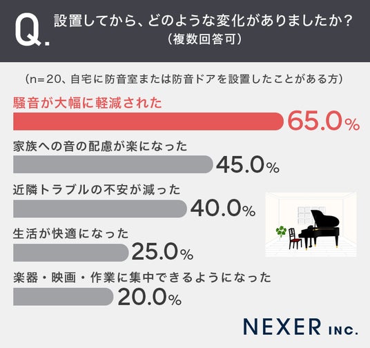 65.0%が「騒音が大幅に軽減された」、45.0%が「家族への音の配慮が楽になった」、40.0%が「近隣トラブルの不安が減った」、25.0%が「生活が快適になった」、20.0%「楽器・映画・作業に集中できるようになった」と回答しました。