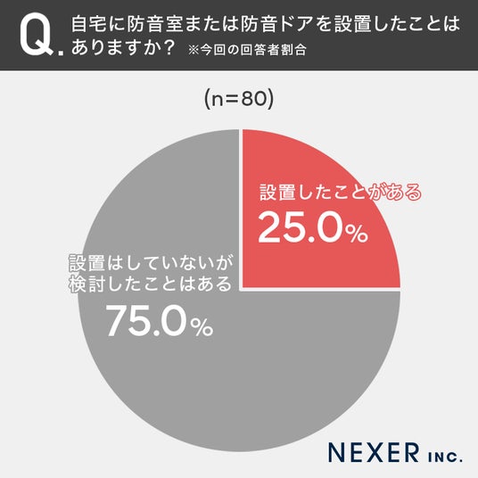そこで今回は有限会社幸昭と共同で、事前調査で「自宅に防音室または防音ドアを設置したこともしくは検討したことがある」と回答した全国の男女80名を対象に「防音室・防音ドアの設置」についてのアンケートをおこないました。