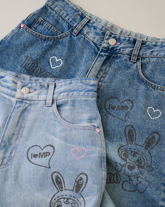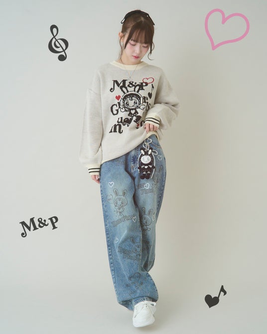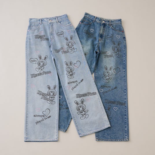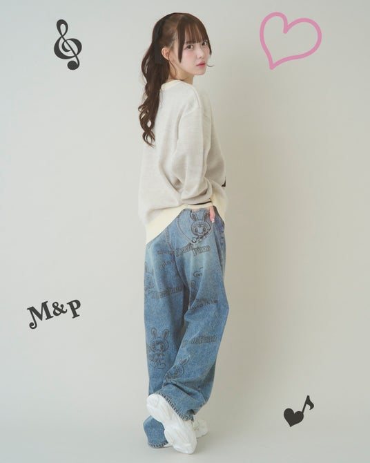 手描き風のベリエちゃんプリントにきらきらハートが目を引く、程よいゆったり感が今の気分にフィットするワイドデニム。 バックスタイルのハートポケットがガーリーさをプラス。