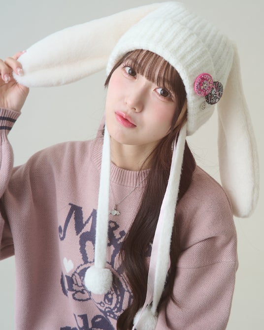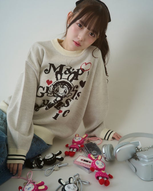ヘッドホンにローラースケートを履いた、平成POPなベリエちゃんが主役のジャカードニット。存在感たっぷりのベリエちゃんと、袖口のト音記号モチーフがポイント。
