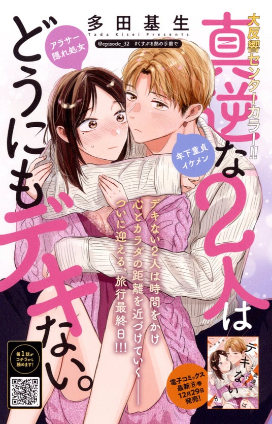 巻中カラーは、12月29日に電子コミックス最新8巻が発売する『真逆な2人はどうにもデキない。』。アラサー隠れ処女と年下童貞イケメン、デキないけどシたい2人の初旅行の行方は…!?