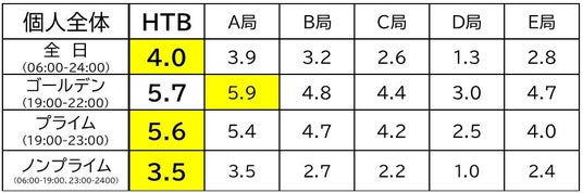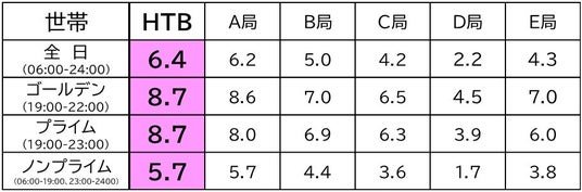 HTB北海道テレビ放送は、2025年「年間」の札幌地区視聴率において、個人全体視聴率(4才以上)は全日・プライム・ノンプライムの三冠!世帯視聴率は全日・ゴールデン・プライム・ノンプライムの4冠に輝きました!世帯視聴率のノンプライム1位は、開局以来初!