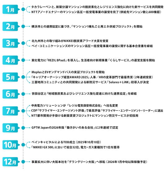 昨年は、マンション一括受電を軸とした事業基盤を強みに、自治体・企業との連携やパートナー企業との協業を通じて、家庭分野の脱炭素と災害時レジリエンスの両立に向けた取り組みを推進してきました。