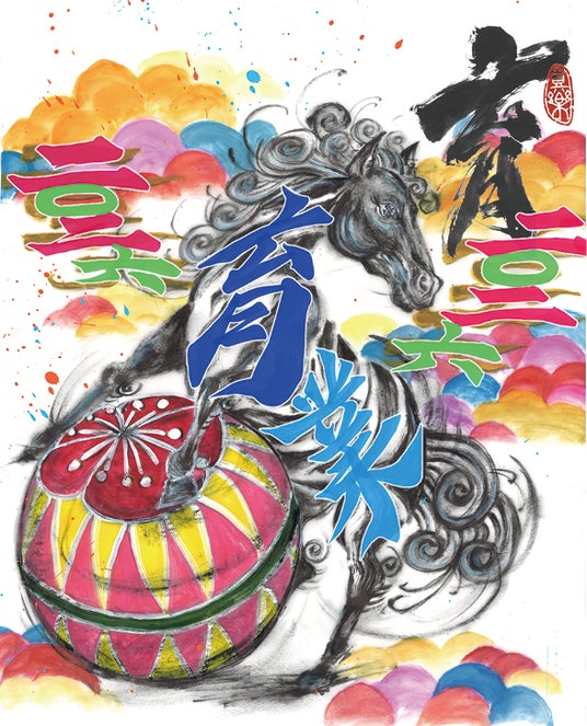 原愛梨さんの書道アートは、書と絵を融合させた独自の世界観が魅力。今回は「育業」の漢字で馬の体を書き、躍動感を見事に表現しています。