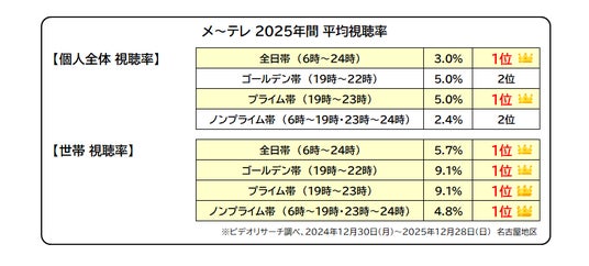 メ~テレは、2025年の年間平均視聴率で、個人全体は全日・プライム帯の2冠、世帯は全日・ゴールデン・プライム・ノンプライム帯の4冠を獲得しました(ビデオリサーチ調べ、2024年12月30日(月)~2025年12月28日(日) 名古屋地区)。年間の平均視聴率で個人全体の全日帯が1位となったのは現行の調査方式に変わった2005年4月以降で初、また世帯の全日帯が1位となったのは1981年以来、NP帯が1位となったのは集計開始以来初、となります。