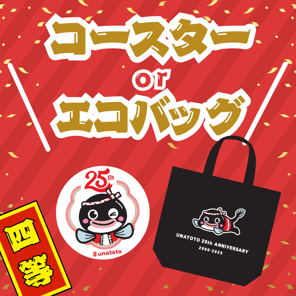 4等は、宇奈ととの25周年を、もっと気軽に、もっと身近に感じてもらうための記念アイテム!とと子のコースターとエコバッグには、「とと子」のイラストをあしらいました。