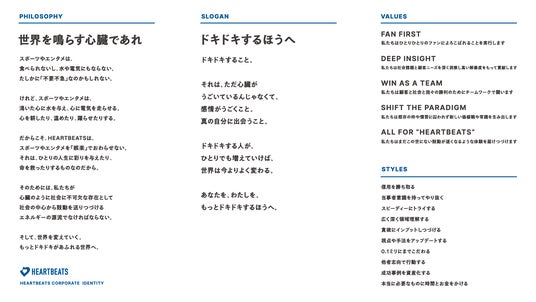 スポーツやエンターテインメントは「不要不急」なものではなく、人々が活き活きと生きていくために不可欠なものだと考えています。スポーツやエンターテインメントの力で世界中の人の鼓動を鳴らし、真に社会にとって不可欠な存在になるという思いを込めてHEARTBEATS(ハートビーツ)と名付けました。