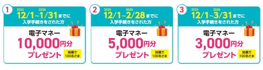 下記の期間中に入学手続きを完了された方の中から、抽選で各100名様に電子マネーをプレゼント[1] 2025年12月1日~2026年1月31日まで 電子マネー10,000円分プレゼント(100名様)