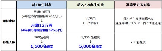 また、新2,3,4年生となる大学生を対象とした「応援給付金」についても、人数を5,000名に増やして募集します。(前年度は3,500名を採用)