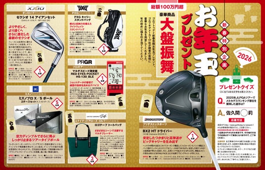 そしてお年玉企画として、読者のみなさんに日頃の感謝を込めて、ゴルフクラブやゴルフグッズを合計100名様にプレゼント! さらに100名様を無料プレーにご招待! どしどし、ご応募ください。