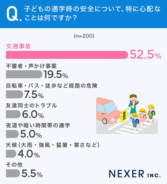 次いで「不審者・声かけ事案」が19.5%、「自転車・バス・徒歩など経路の危険」が7.5%という結果となりました。