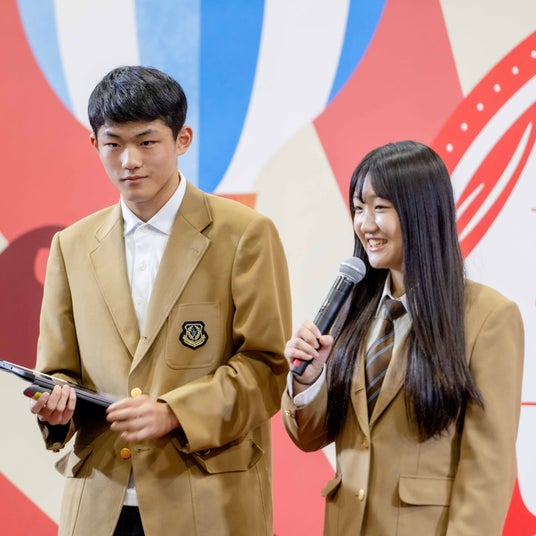 EXPO2025大阪・関西万博で発表した1期生の鈴木聡真さん(前列左)・鈴木杏さん(前列中央)・齋藤悟さん(前列右)