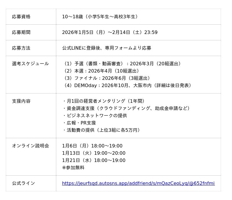 デジタル空間・eスポーツ・メタバースを活用し、自治体や企業と連携しながら地域課題の解決と都市価値の向上に取り組む株式会社Meta Osaka(所在地:大阪府大阪市、代表取締役:毛利英昭)は、10~18歳の若者が社会課題解決に挑戦する起業家育成プログラム「YOUNG IMPACT(ヤング・インパクト)」の2期生募集を2026年1月5日より開始します。2025年10月、EXPO2025大阪・関西万博で始動した1期では、難民支援に300万円を調達した中学生兄妹や、地方から世界に挑戦する中学生など2組3名を選出しました。本プログラムは従来の「発表して終わり」のピッチコンテストではなく、経営者が1年間伴走し、若者の挑戦を実践的にサポートする新しい育成の仕組みです。2期では対象を10~18歳に拡大し、DREAM PARTNERS(メンター)陣も増員するなど、支援体制をさらに強化します。