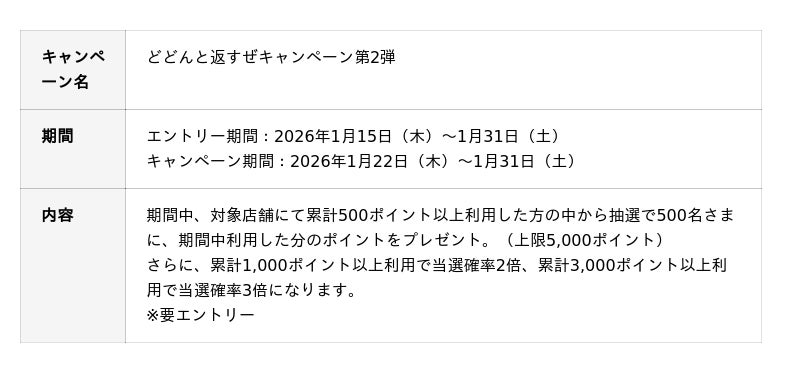 2025年10月に実施したキャンペーンの第2弾!ポイント利用の条件達成で、抽選で500名さまに利用した分のポイントが戻ってくる!