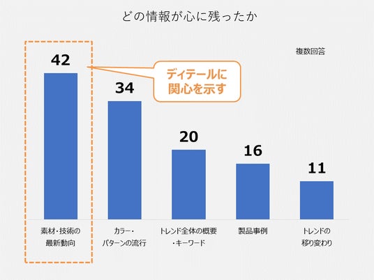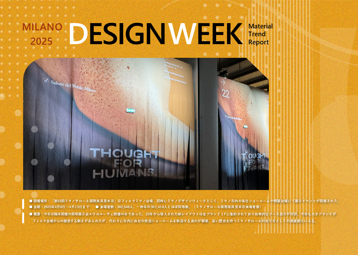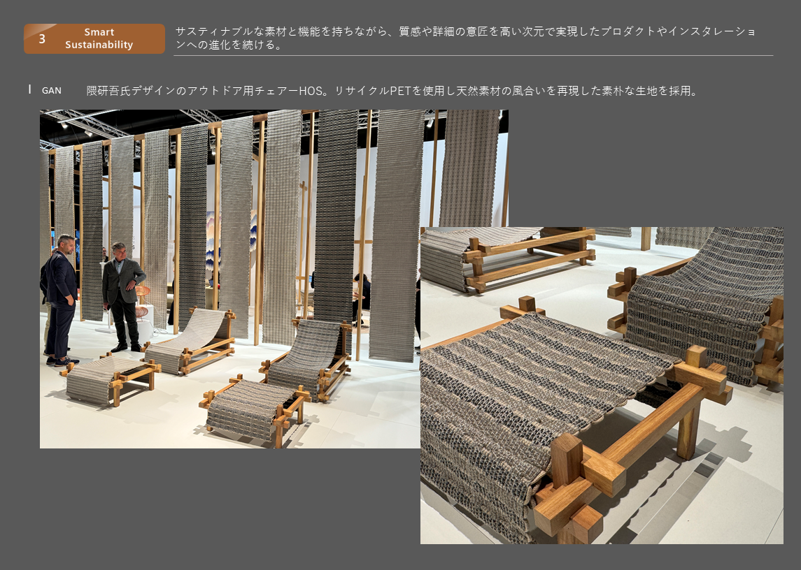 を得ることができました。また、トレンド全体の兆候以上に、出展されていたプロダクトに使用されていた素材や技術の最新動向が心に残ったという結果となったことや、後日提出された講義レポートにはエコデザインや環境配慮といったサスティナビリティに対する言及が数多くあり、アウトプットの根幹にあるディテール部分への関心の高さが伺えました。