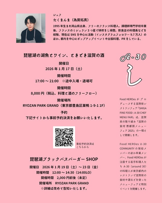 株式会社Food HEROes(代表取締役:江六前一郎、本社:東京都目黒区、以下Food HEROes)は、2025年度に開催される「滋賀の食材 首都圏メニューフェア2025」で、2026年1月11日(日)からA-30(Around Thirty)の料理人9名によるレストランフェア「SHIGA FINE FOOD : A-30 CHEF MENU FAIR」と題し実施します。さらに期間中の1月17日(土)には、Food HEROesとインスタグラマーの為房拓真氏(たくまんま)が主催するイベントを巣鴨で開催します。