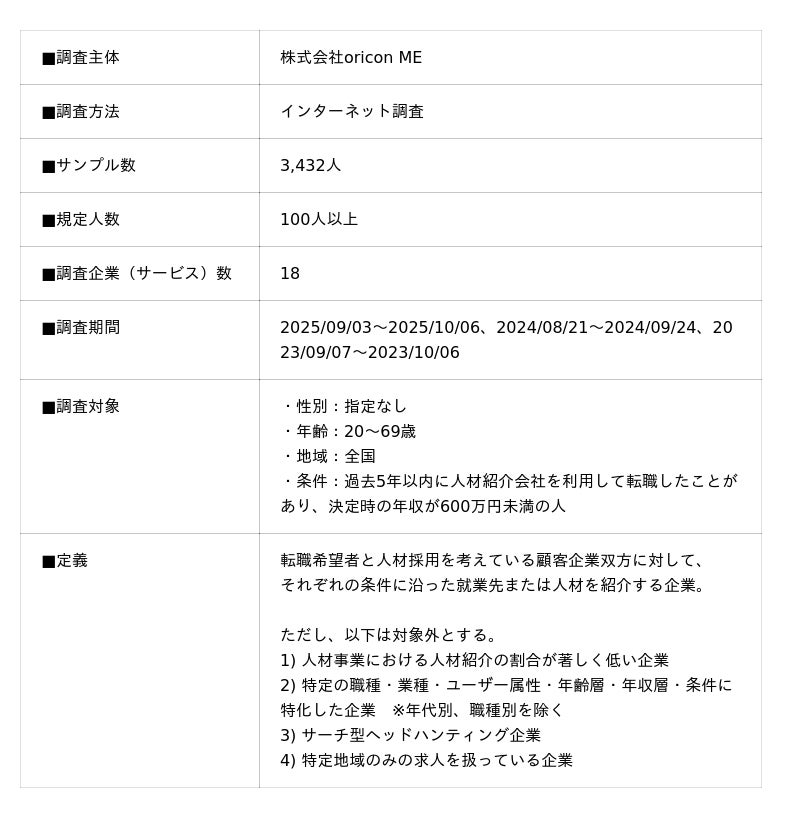 「転職エージェント」ランキングは、「利用のしやすさ」「担当者の対応」「紹介求人の豊富さ」「紹介求人の質」「交渉力」といった5つの評価項目と、「男女別」「属性別」「年代別」「職種別」の4つの部門で構成されています。『エン エージェント』はそのうち評価項目の「紹介求人の質」、および年代別部門の「30代」にて、満足度第1位の評価をいただきました。引き続き、入社後活躍を支援する転職エージェントとして、求職者に寄り添ったサービスを展開してまいります。2026年 オリコン顧客満足度調査 転職エージェント 調査概要
