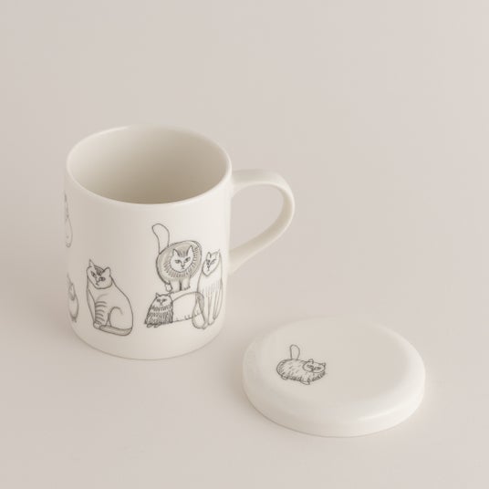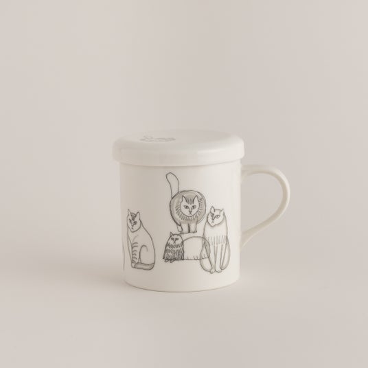スケッチねこが描かれた、美濃焼のマグカップ。白を基調としたシンプルなデザインで、ふたの部分にもねこのモチーフがあしらわれています。ふたは裏返して、豆皿のようにお使いいただけます。