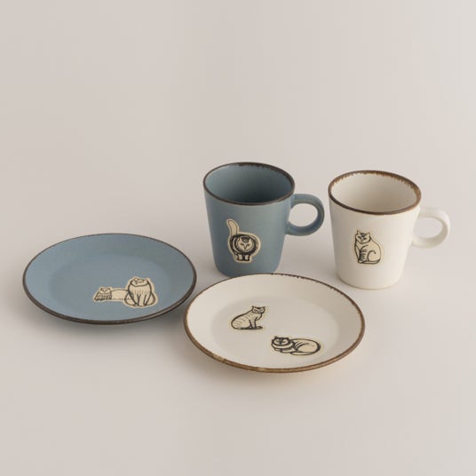 益子焼でつくられた、カップとプレートのセット。マットな釉薬の質感に、スケッチねこの部分のみ撥水加工を施しました。シンプルな佇まいの中に、さりげない愛らしさが感じられるデザインです。プレートはソーサーとしてもお使いいただけます。