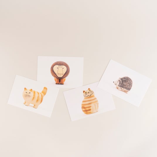 展覧会グッズの定番、ポストカード。今回の展示で初公開となるリサのスケッチを用いたデザインや、ミアが生まれるまでの制作プロセスをたどるデザイン、そして展示のキーとなる「リサの道具」をモチーフにしたものまで揃いました。定番の陶器作品のポストカードもご用意しています。