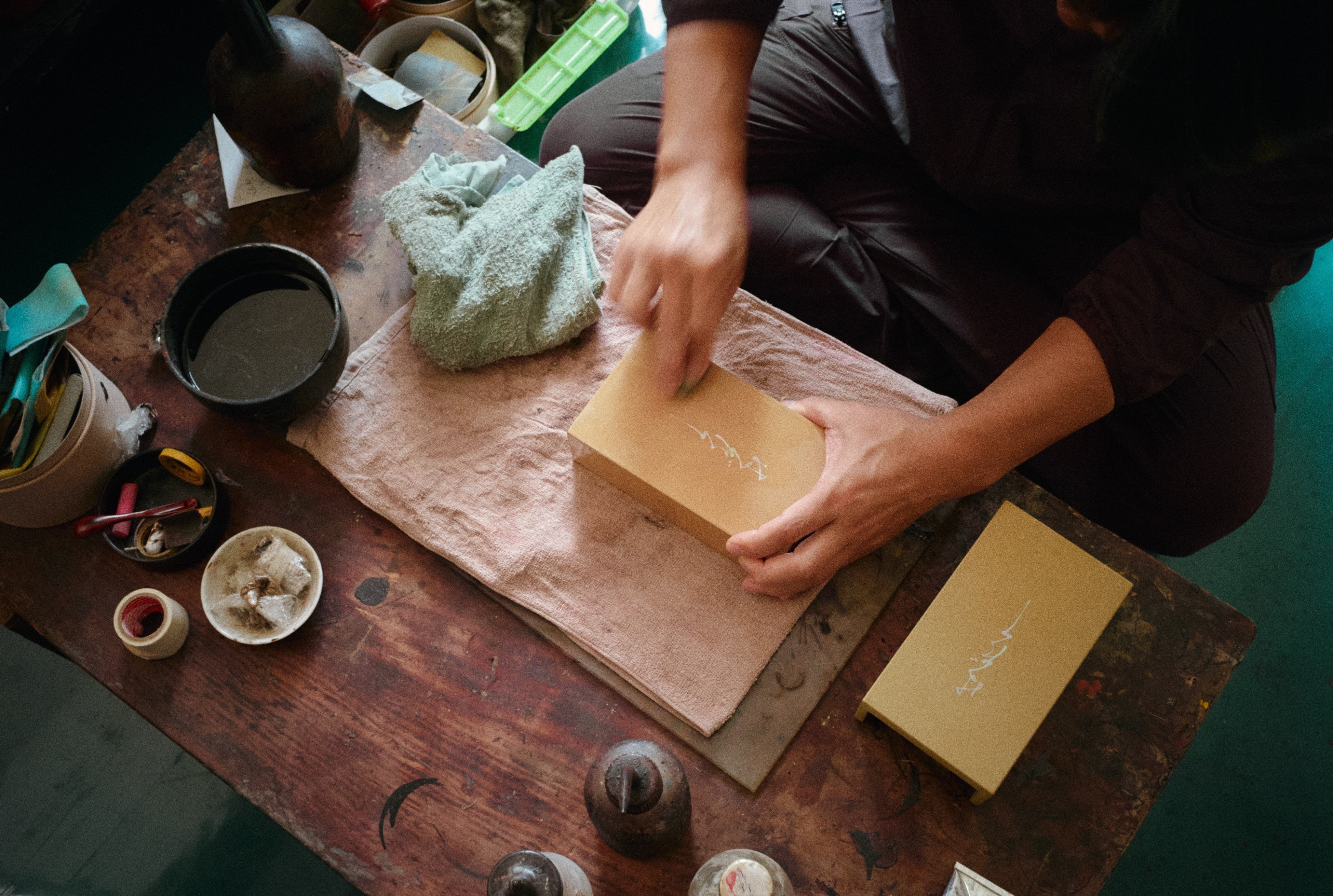 『はだての生うに』を納める木製総漆塗り箱~午~は、大本山永平寺御用達の漆器工房・漆琳堂 が制作しました。創業1793年(寛政5年)、初代・忠治郎から受け継がれる伝統の技を、漆芸家・ 内田徹が現代的なデザインへと昇華させています。 玉手箱の木地は指物の技法を用いて特注で制作し、塗りは黒本漆による“塗り立て仕上げ”。磨きをかけず、一度の刷毛塗りのみで深い艶を生み出す高度な技法です。加えて金箔による装飾を施し、 形状から塗りに至るまで漆器の粋を凝縮した、格調高いパッケージに仕上げました。さらに本金粉を用いた専用の箸および匙も制作。今回新たな試みとして、うにを収める木折を白漆、ロゴを 螺鈿で仕立て、木折そのものを一つの“食器”と見立てる演出を採用し、日本ならではの「見立ての 文化」を体現しています。玉手箱に描かれる干支デザインは毎年新作を制作予定で、コレクション性の高い商品としてもお 楽しみいただけます。
