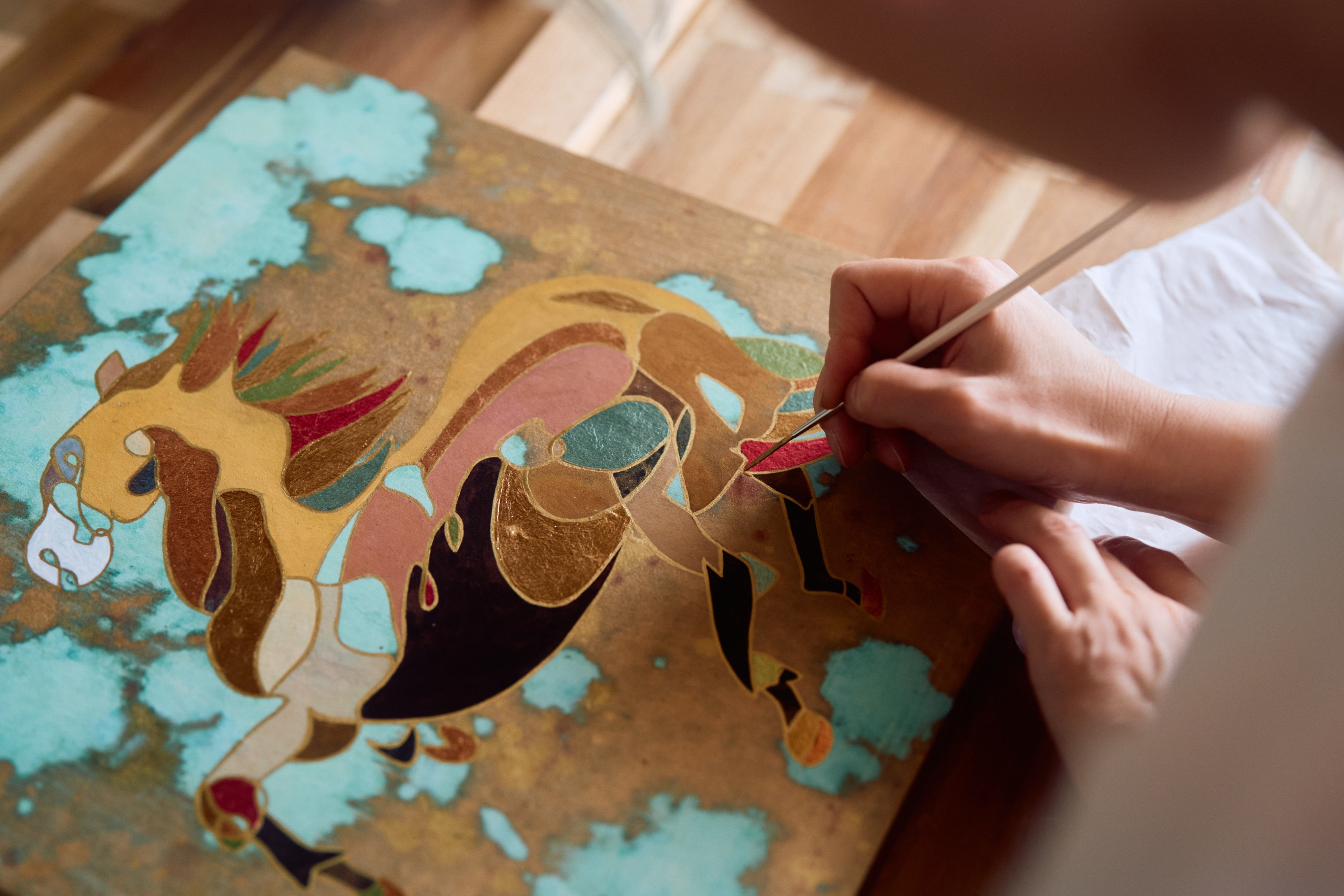 絵図:美術家 Nao Morigo漆器を彩る絵図は、国内外で活躍する美術家 Nao Morigo が、新年の祈りと希望を込めて特別に描いた干支「午」をテーマにしたアートワークです。