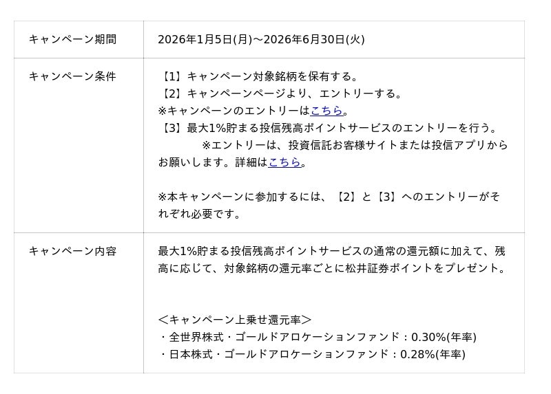 松井証券株式会社(本社:東京都千代田区、代表取締役 社長執行役員:和里田 聰、以下「当社」)は、2026年1月5日(月)より、りそなアセットマネジメント社の2銘柄を対象に、「最大1%貯まる投信残高ポイントサービス増量キャンペーン」を実施します。