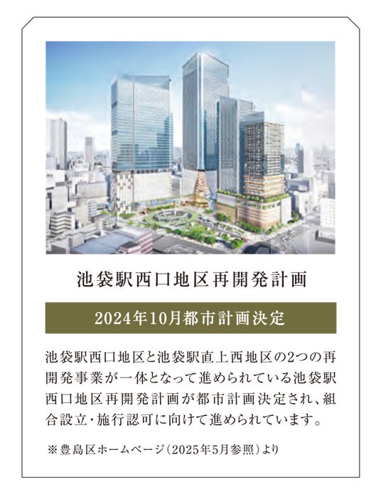 駅前立地を活かし、商業・業務・居住といった多様な都市機能をバランスよく配置した街づくりが構想されており、池袋の玄関口としての役割をさらに高めることが期待されています。将来的な利便性や街のブランド力向上に加え、周辺エリア全体への波及効果も見込まれる注目の再開発プロジェクトです。池袋駅への高いアクセス力を誇るエリアの価値も同様に向上していくことが期待されます。