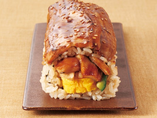 穴子三昧(活〆穴子使用)【1本1,980円(税込2,138.40円)】「穴子」と相性抜群な「玉子」、「きゅうり」を「昆布醤油炊き込みご飯」で巻き、さらに1枚あたり約50gの「活〆炙り煮穴子」を太巻きに2枚のせた、穴子好きにはたまらない商品です。