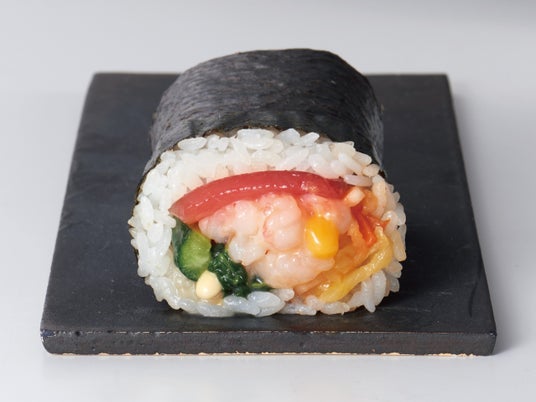 まぐろや海老が入った海鮮ユッケ風太巻 【ハーフ598円(税込645.84円)】まぐろやえびなどの海鮮と、ナムルや刻みたくあんを組み合わせ、卵黄ソースとピリ辛味のユッケだれで味付けした太巻きです。韓国料理のエッセンスを取り入れた、旨みと食感のバランスが楽しめます。