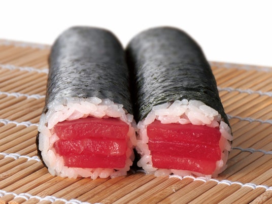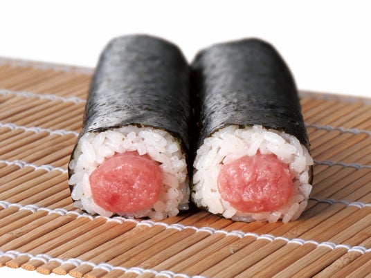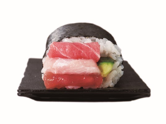 本鮪中トロが入った3種のまぐろ巻 【1本1,380円(税込1,490.40円)、ハーフ698円(税込753.84円)】コクがあり、脂のりが良い「本鮪中トロ」や「めばちまぐろ」、「びんちょうまぐろ」を豪華に盛り込みました。まぐろ好きな方にぜひおすすめしたい商品です。